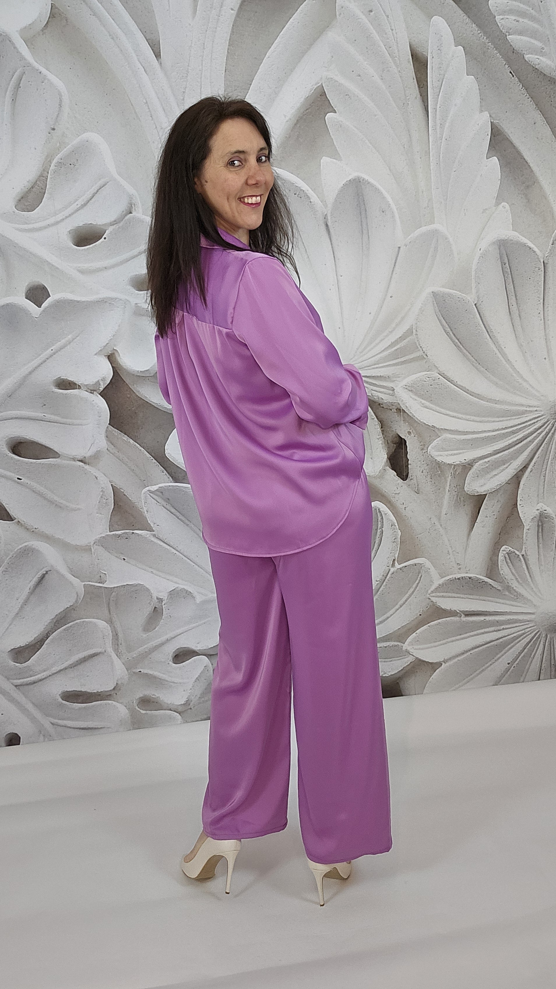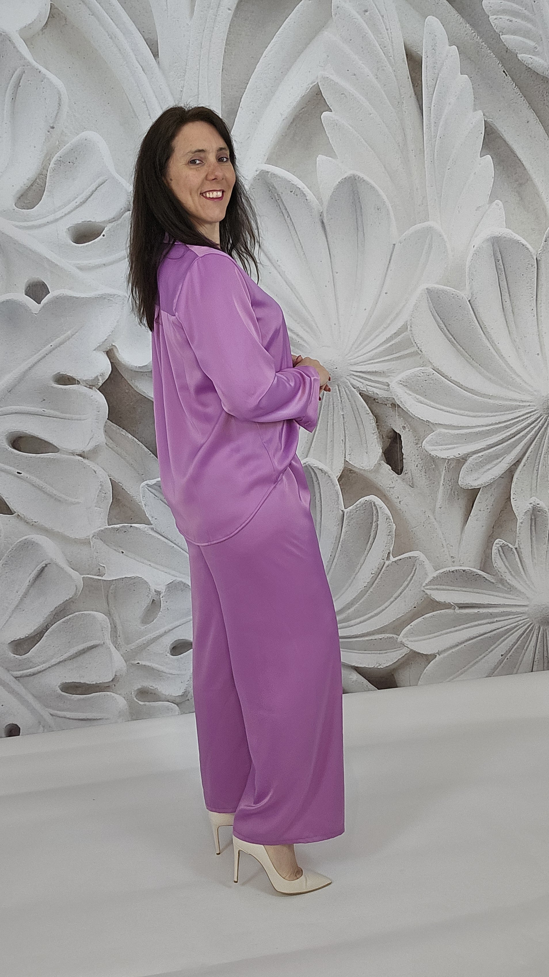 Un ensemble che incanta al primo sguardo! Questo completo due pezzi in satin color blu royal è l’emblema di uno stile raffinato e contemporaneo. La camicia a maniche lunghe, morbida e fluida, è impreziosita da una cintura in pizzo tono su tono che valorizza la silhouette, mentre il pantalone palazzo dona slancio ed eleganza a ogni movimento.