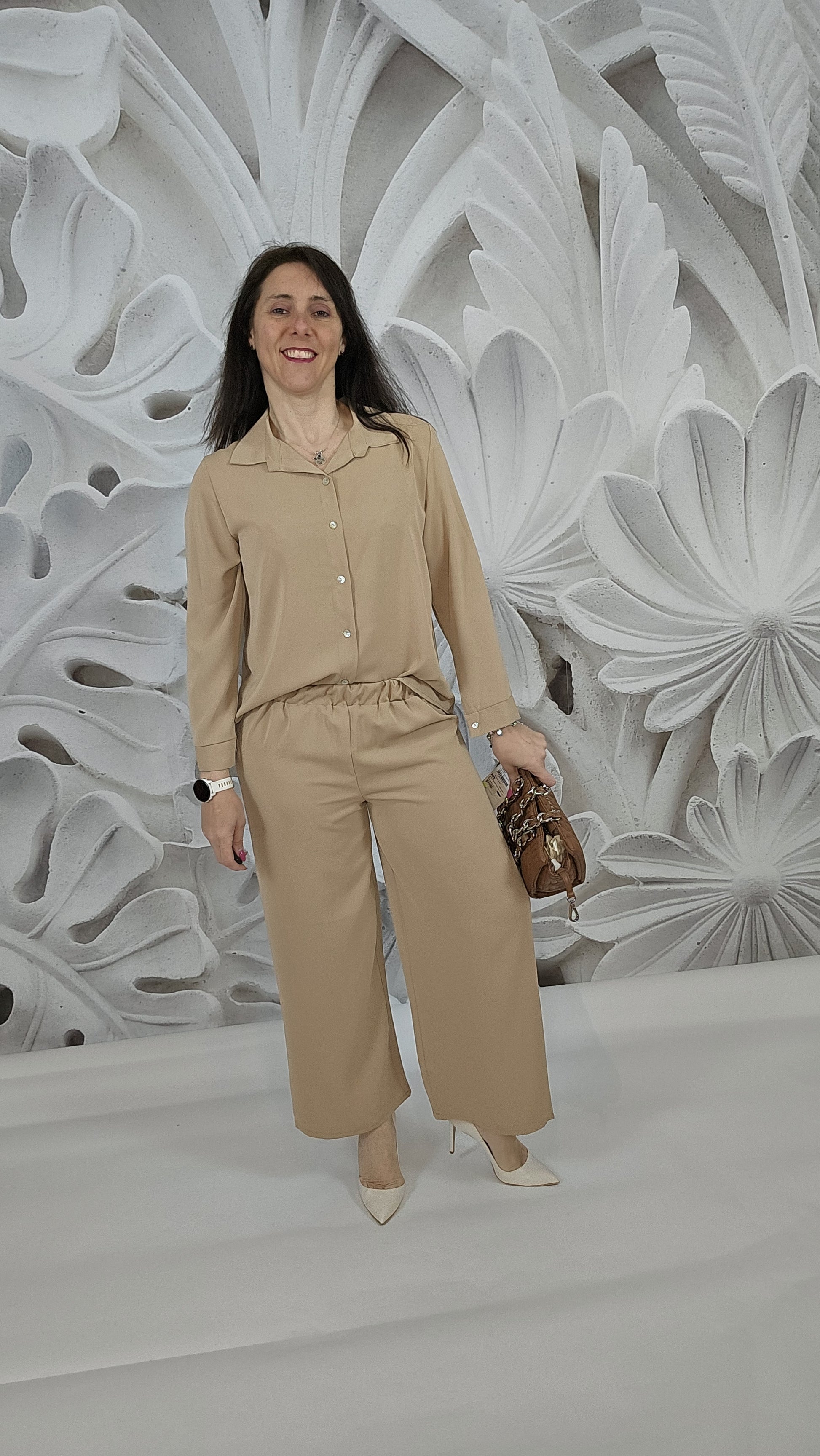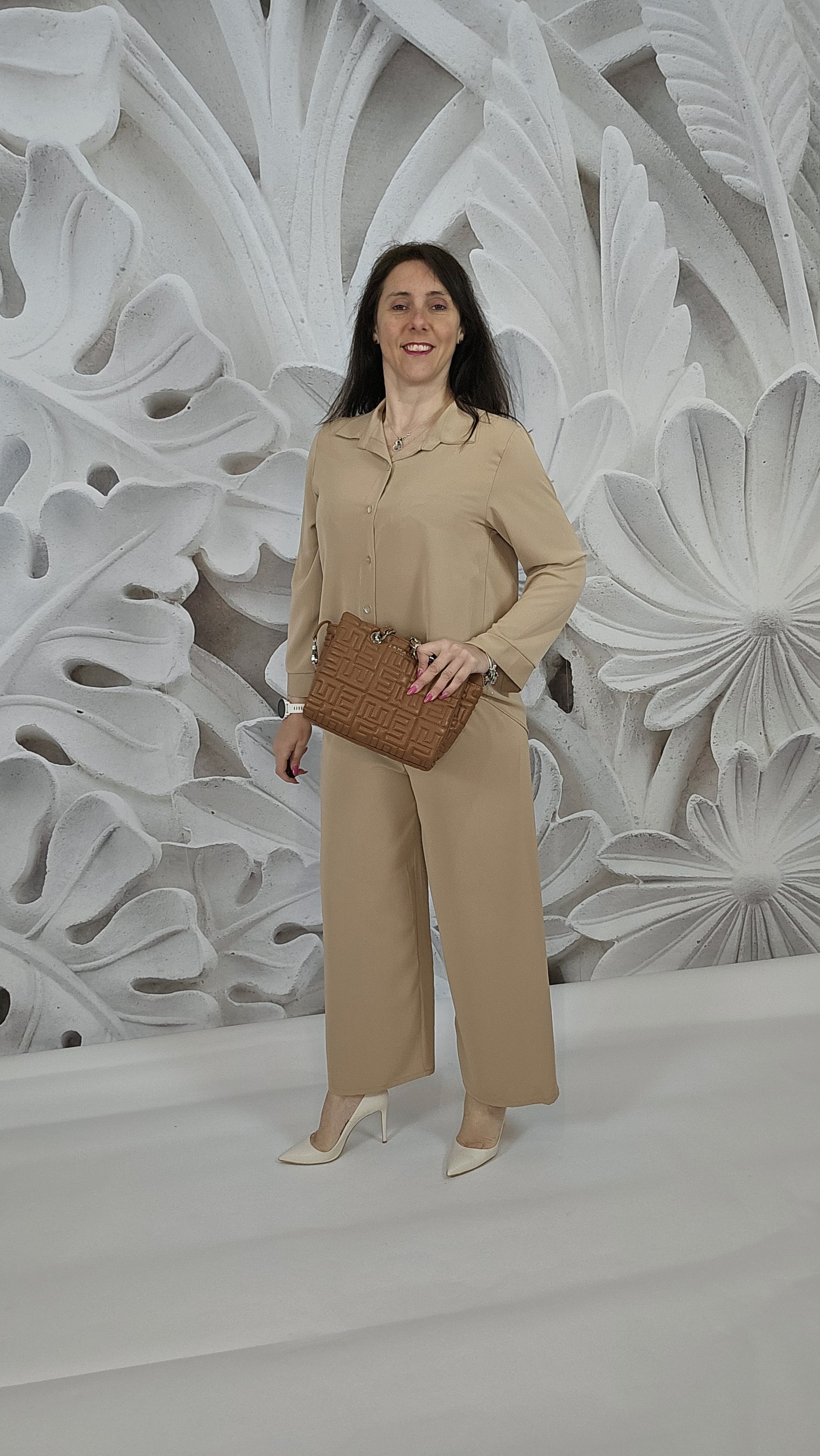 Un ensemble che incanta al primo sguardo! Questo completo due pezzi in satin color blu royal è l’emblema di uno stile raffinato e contemporaneo. La camicia a maniche lunghe, morbida e fluida, è impreziosita da una cintura in pizzo tono su tono che valorizza la silhouette, mentre il pantalone palazzo dona slancio ed eleganza a ogni movimento.