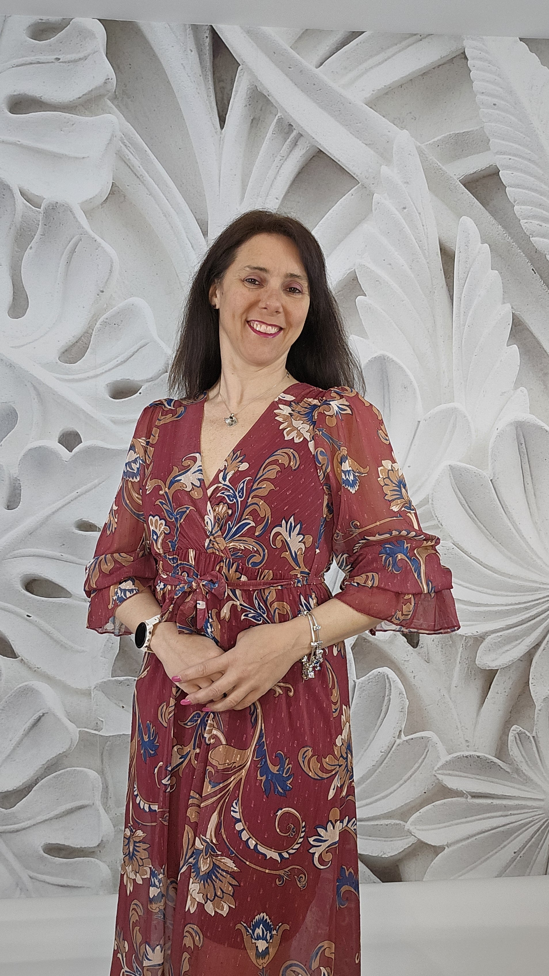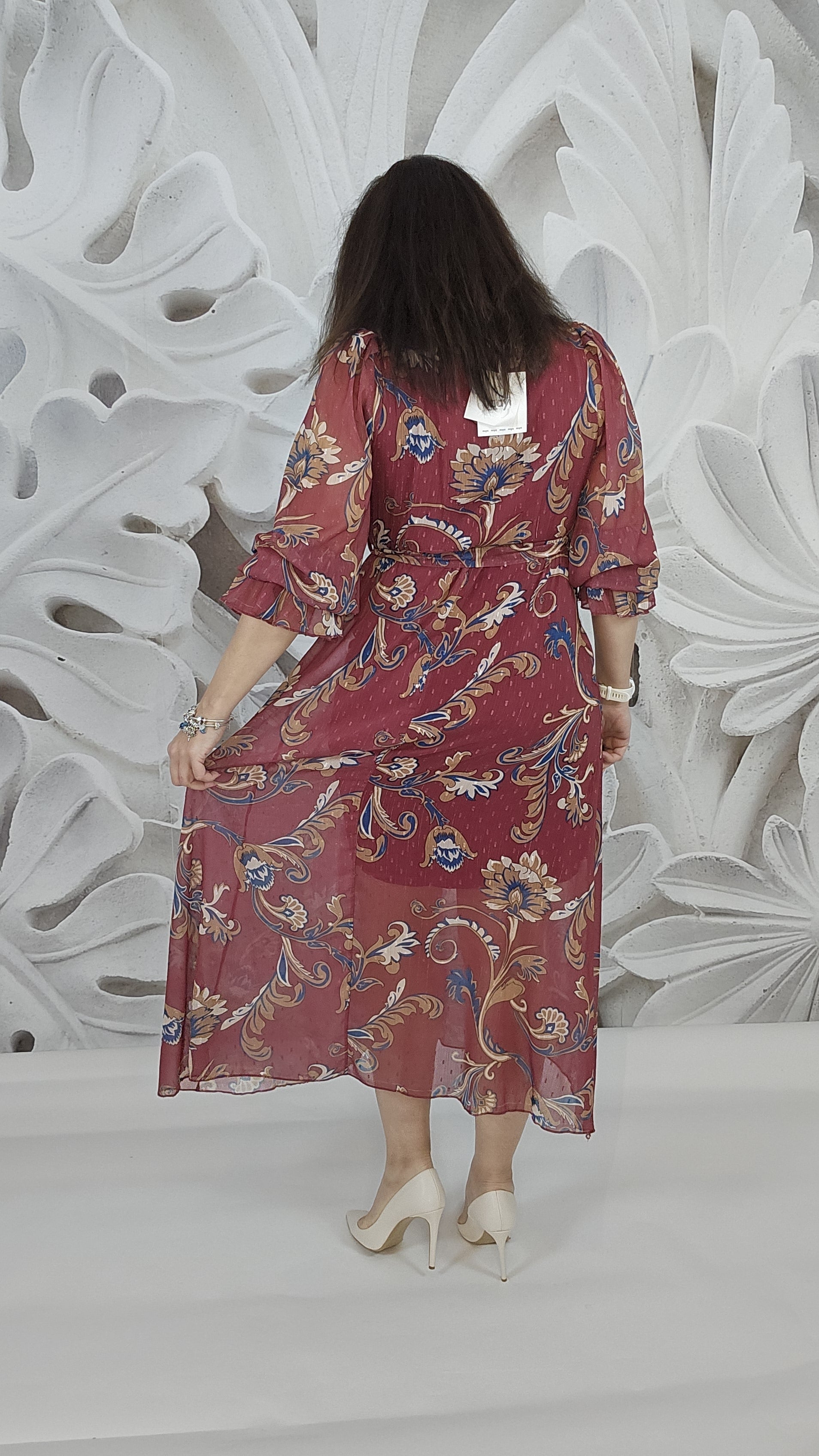 Un vestito che unisce charme e leggerezza! Questo abito midi in chiffon con stampa floreale su fondo borgogna è la scelta ideale per chi ama uno stile raffinato e femminile. Le maniche a tre quarti con balza, lo scollo a V incrociato e la cintura in vita esaltano la silhouette con grazia e movimento.